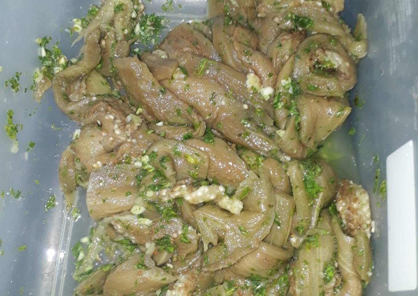 - Luego hervir las berenjenas en agua con un poco de vinagre. Cuando las berenjenas estén listas y frías preparar el ajo y perejil picarlo y agregar en un bowl junto con las berenjenas. a esto incorporar vinagre y aceite a gusto