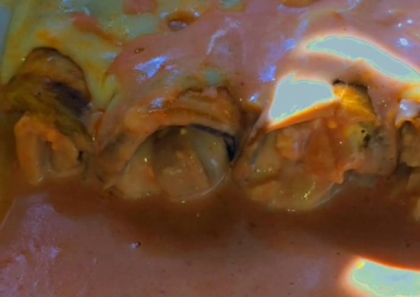 - Al sacar las berenjenas del horno, las pinte con salsa solo de un lado. Por encima de la salsa, agregué una feta de muzarella y puse por encima de la muzarella un poco de relleno. Luego enrollé cada una de las berenjenas y puse los rollitos en una asadera uno junto a otro.
