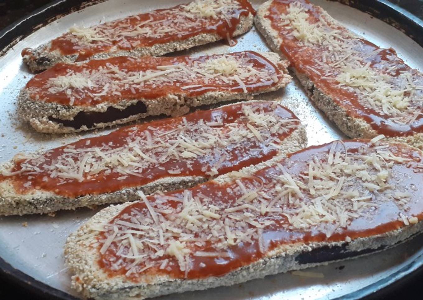 - Luego batir los huevos con los condimentos a gusto. Pasar primero las berenjenas por la harina, luego por el huevo y por último por el pan rallado, colocar en una fuente y llevar a horno luego agregar la salsa de tomate y el queso y volver a llevar al horno hasta que se derrita el queso.