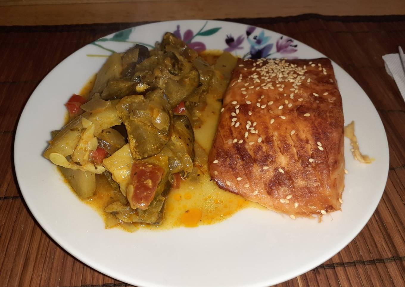 Salmón al horno con guiso de berenjenas y zucchini