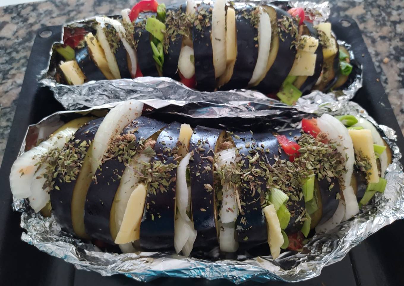 - Acomodá tus berenjenas rellenas en "cunitas" hechas con papel aluminio. Luego, esparcí sal, pimienta y orégano por arriba y un chorrito de aceite de oliva. Por supuesto, podrás usar los condimentos que prefieras. Las cunitas evitarán que el juguito se pierda y además, si usas una parrilla, te permite que no se toque con la carne y manipularlo mejor.