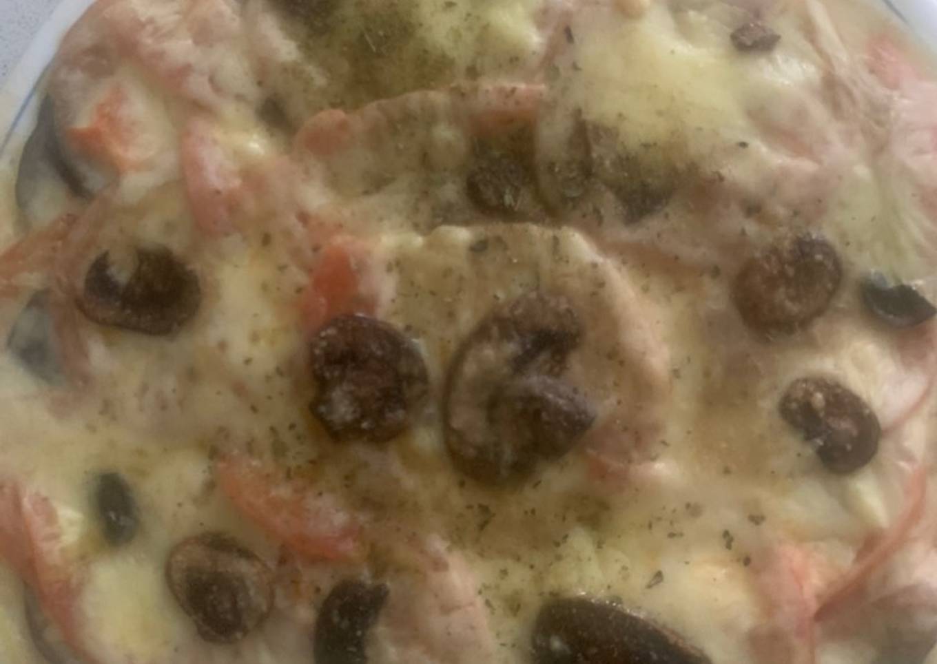 - Tapar todo con el queso mozzarella. Agregar un par de champiñones de decoración y queso parmesano. Un poco de pimienta y orégano.