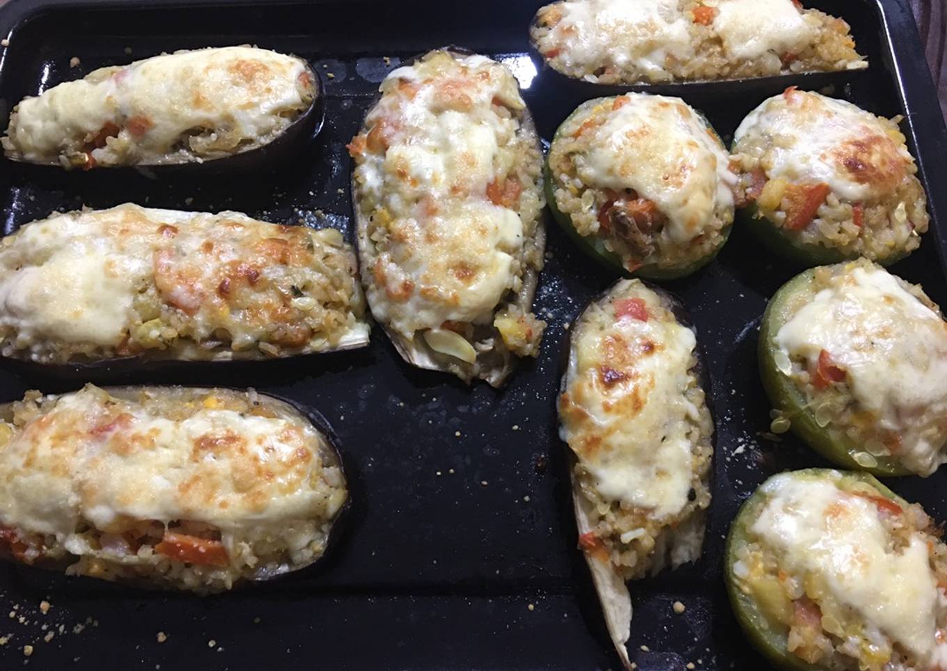 - Rellenar. Poner muzzarella. Chorrito aceite y un poco de queso rallado. Horno fuerte hasta gratinar