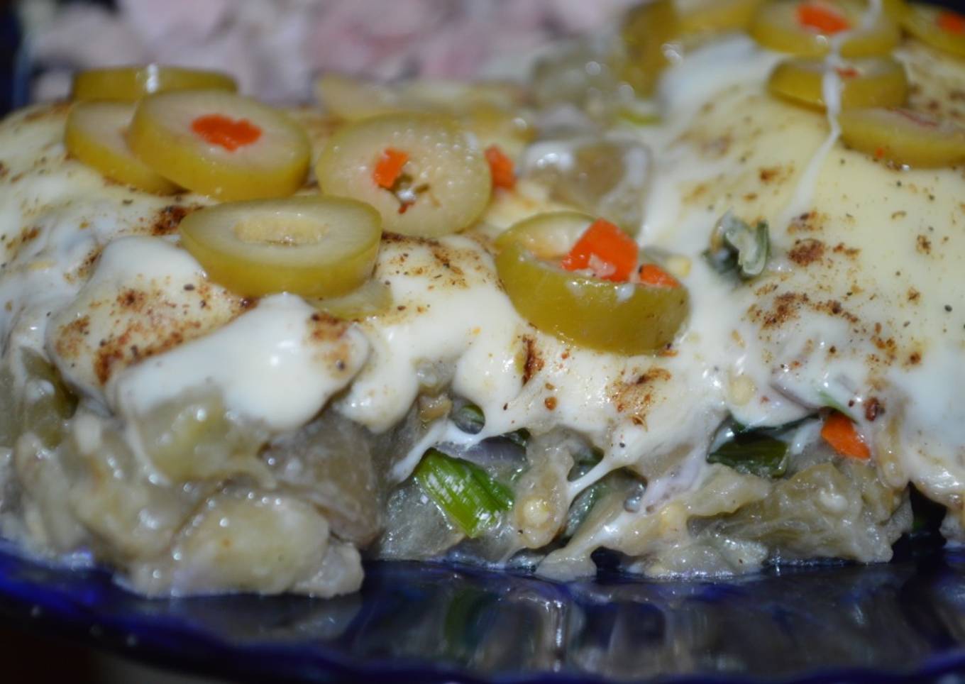 - Colocamos el queso cortado en fetas finas de modo que cubra casi toda la berenjena, espolvoreamos baharat, y llevamos a un horno medio hasta que el queso se funda, quitamos del horno, por último le agregamos las aceitunas cortadas en rodajas.