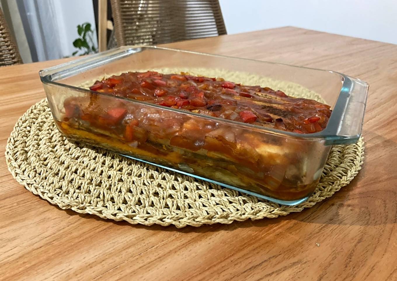 - Colocar en una fuente: una capa de berenjenas, por encima el puré de zapallo, otra capa de berenjena, fetas de jamón cocido y queso cremoso, otra capa de berenjenas y por último cubrir con la salsa