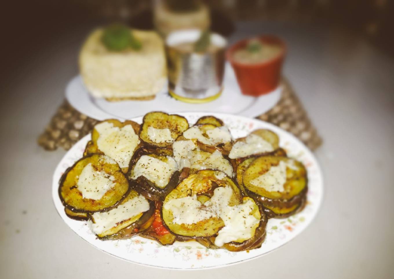 - Una vez terminada todas las berenjenas, emplata en una fuente de losa o plástico: una rodaja de berenjena, un pedazo de tomate, otra rodaja de berenjena y encima queso.