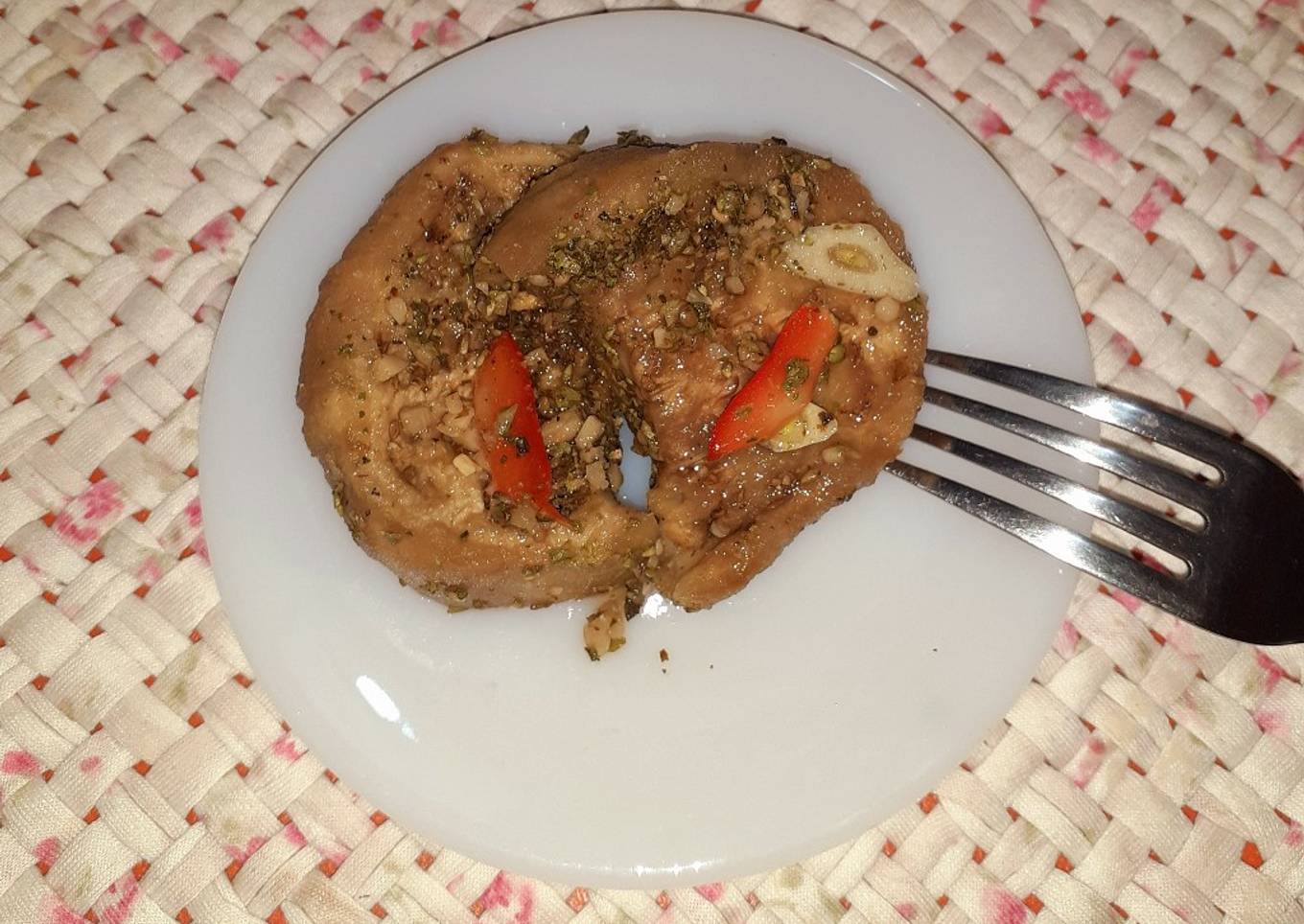 - Ahora en un frasco agregamos un poco de ajo, morrón, las especias y agregamos una rodaja de berenjena y así vamos armando hasta completar el frasco dejando 1 cm de la tapa.