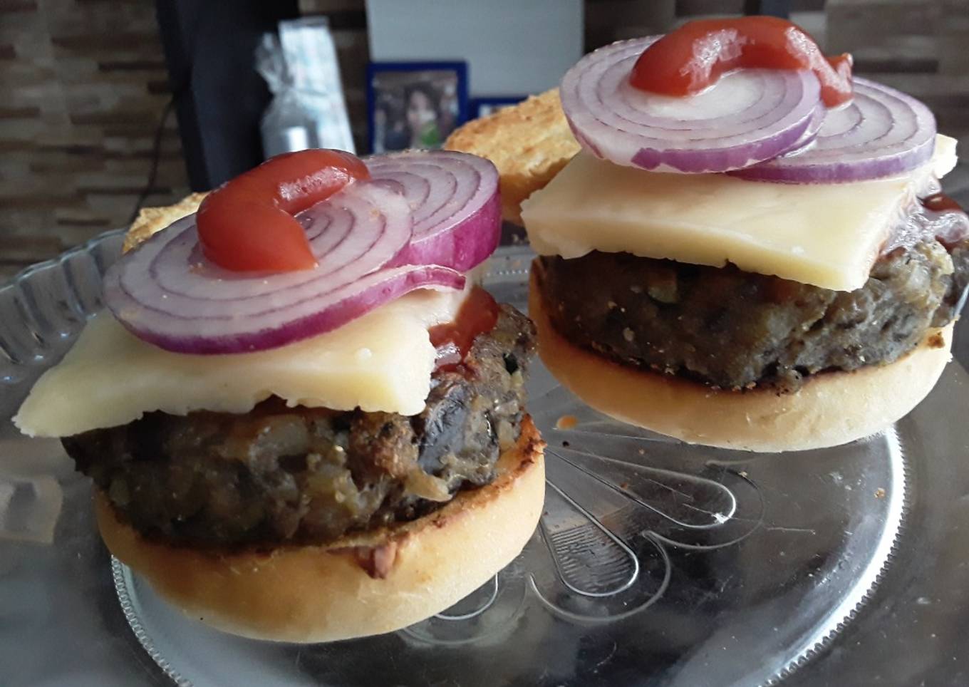- Yo presenté las hamburguesas con pan, queso vegano de arroz, cebolla morada en láminas, salsas bbq, ketchup y mostaza.