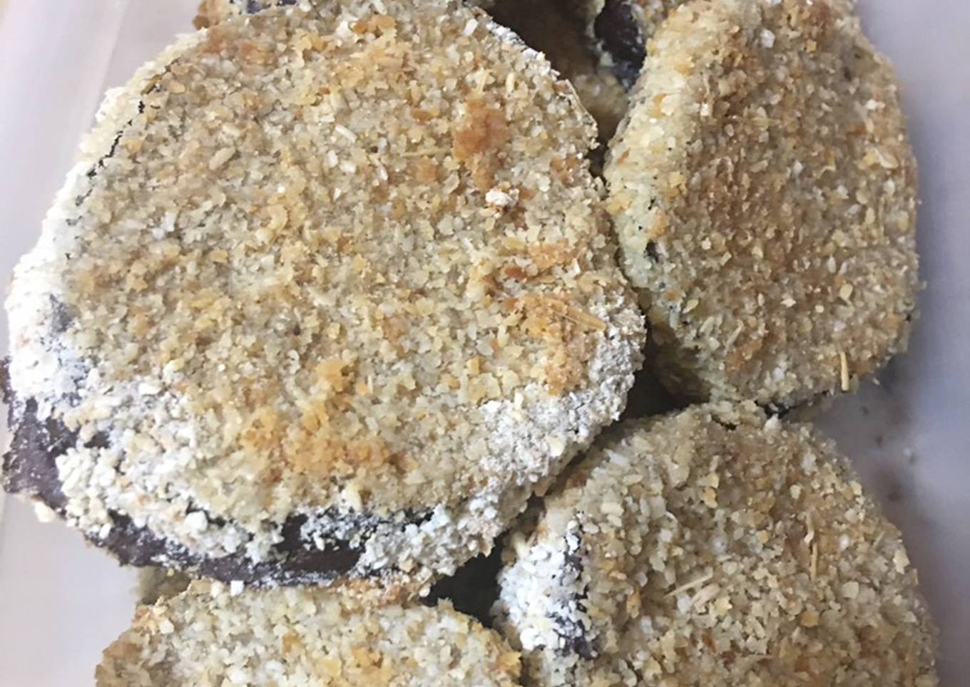 - Cortamos las berenjenas y las ponemos con sal gruesa un rato p que larguen amargor. Las enjuagamos y secamos. Después pasamos por huevo y pan rall