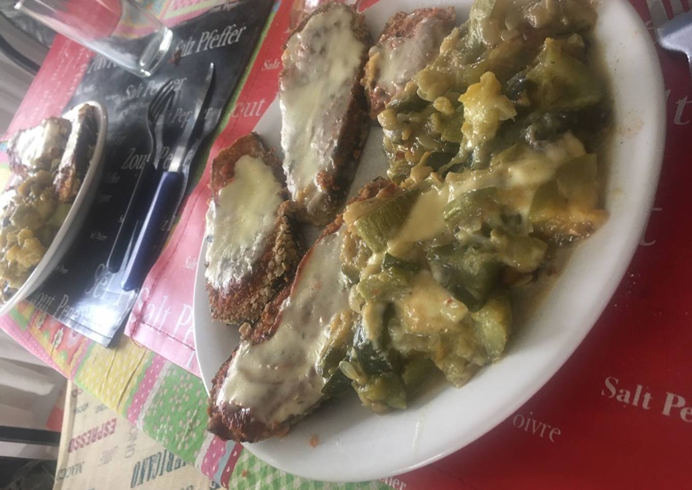 Milanesa de berenjenas con revuelto de zapallito y zucchini con queso