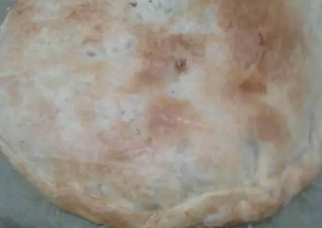- En una bandeja para horno coloqué papel manteca y encima una de las tapas de pascualina, luego volqué encima el relleno, lo acomodé y cubrí con la otra tapa.