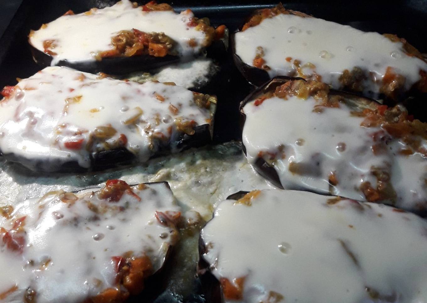 - Cocinamos unos 20mt, luego Rellenamos las berenjenas le ponemos queso por Arriba y lo mandamos al horno Hasta que se derrita el queso