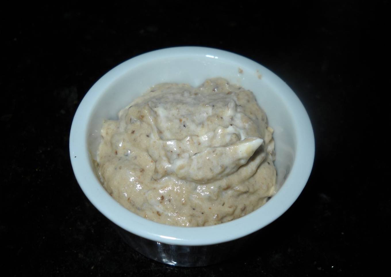 - Poner dentro del vaso del mixer con un par de cucharadas de queso crema (la cantidad depende lo grande de la berenjena)
