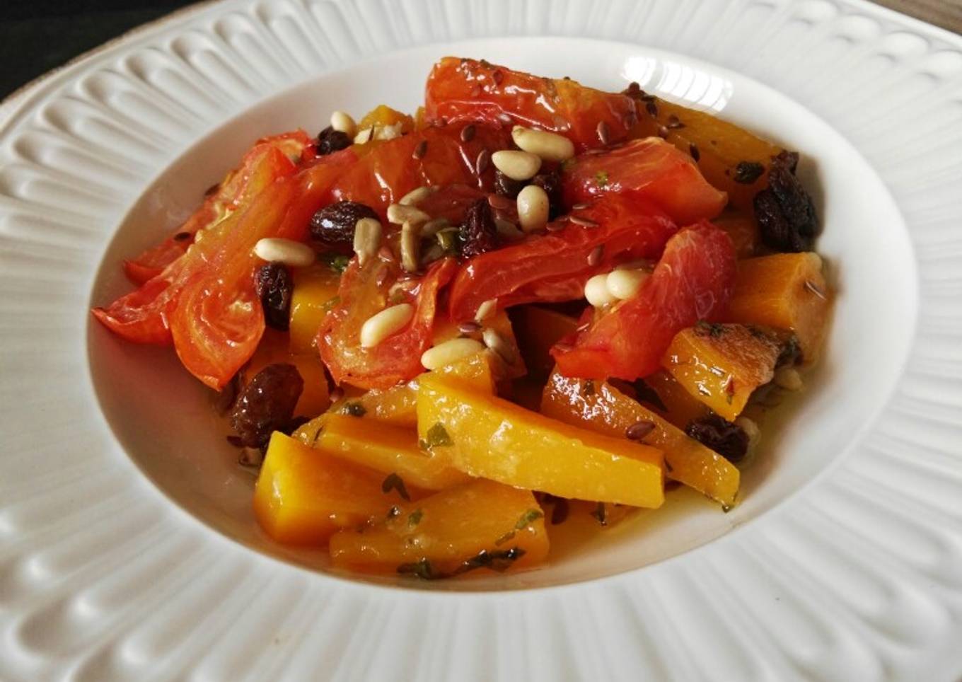 - En un plato de servir ponemos la calabaza y el tomate, añadimos las pasas, los piñones, las semillas de lino y las pipas de girasol