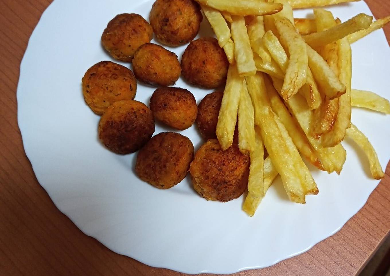 - Escurrir los buñuelos en papel absorbente. Presentar en un plato llano los buñuelos acompañar con papas fritas. Servir.