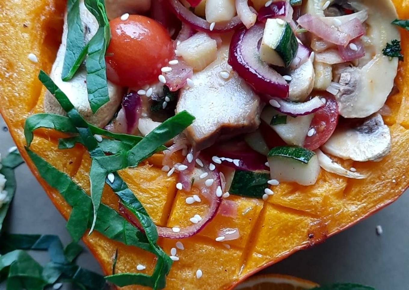 Calabaza rellena vegana de bulgur con verduras en adobo de naranja y lima