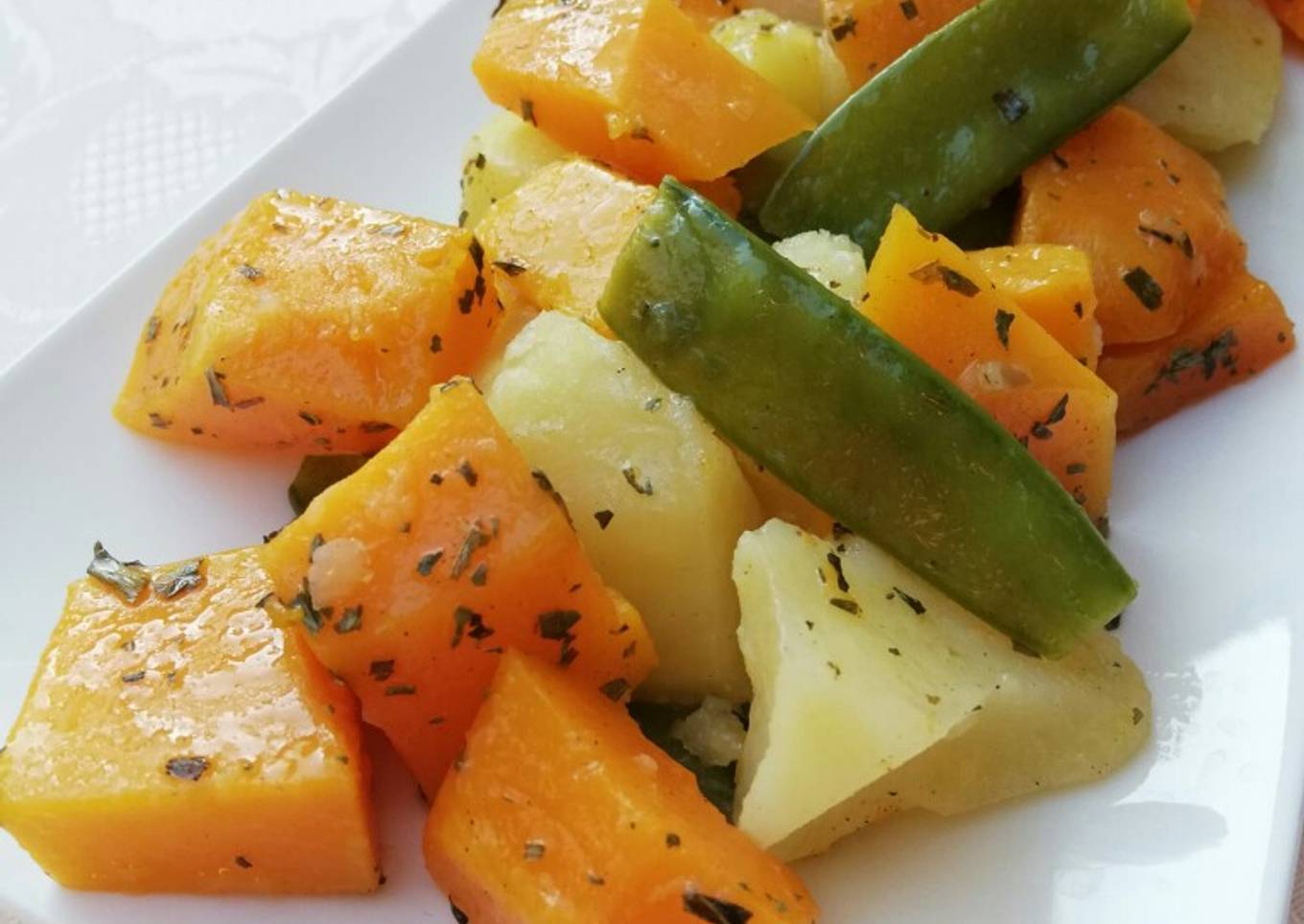 Ensalada templada de patatas, calabaza y tirabeques al estragón