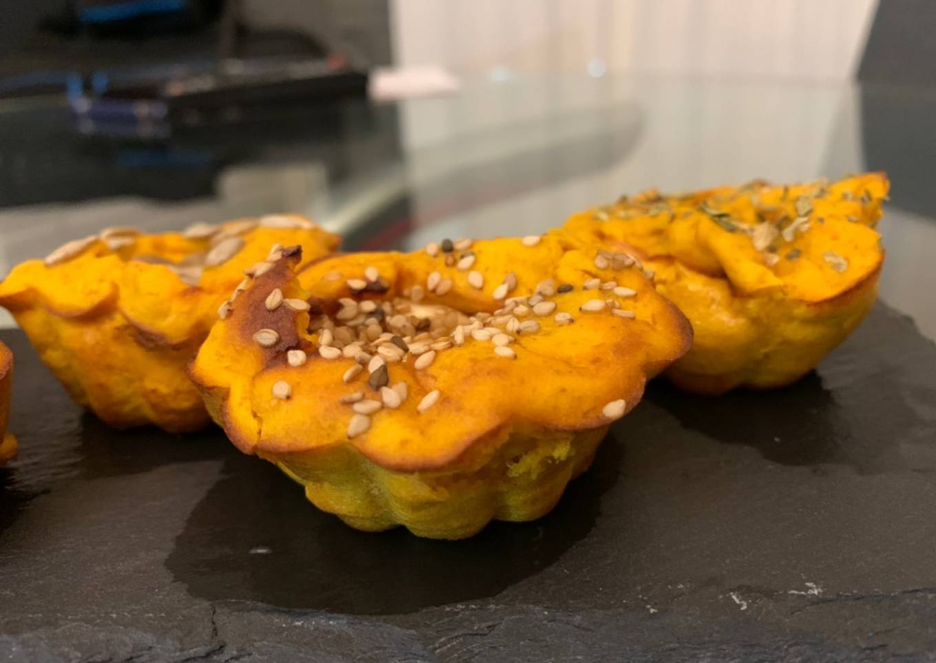 - Batir todos los ingredientes, yo los rellené con taquitos de queso burgos y decoré con sésamo, pipas y orégano