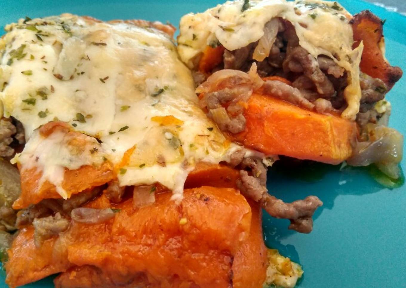 - En un recipiente apto para horno, poner una base de láminas de calabaza, otra de carne y cebolla y por último otra de calabaza.