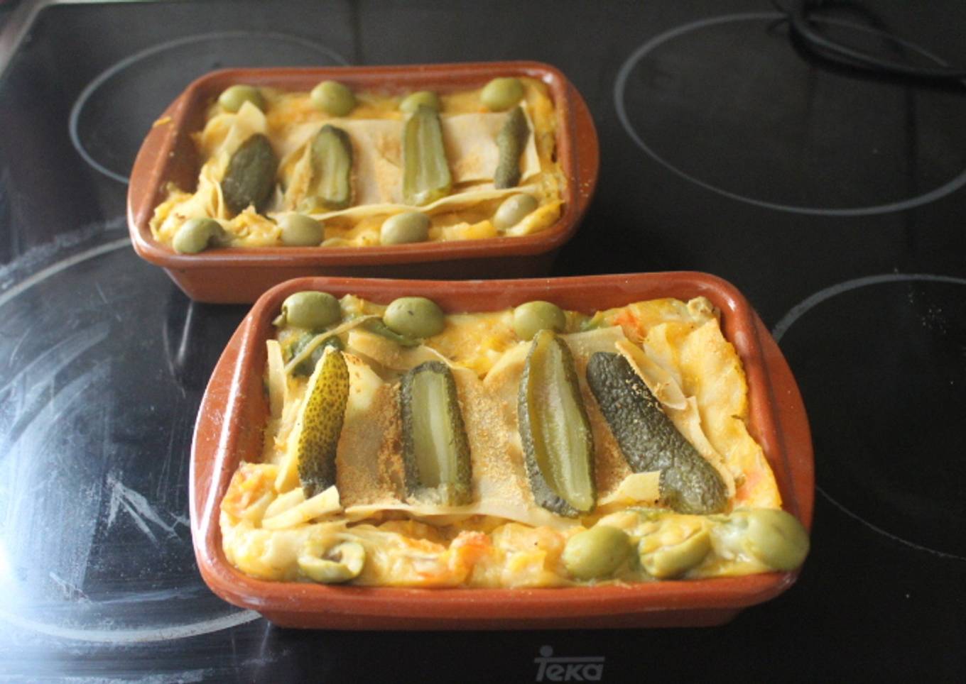 - Aceitamos dos bandejitas individuales de barro y colocamos en el fondo de cada una, una lámina de pasta para lasaña precocida (si son de las normales hay que cocerlas con anterioridad según las instrucciones del fabricante, aproximadamente 20 minutos en agua con sal).