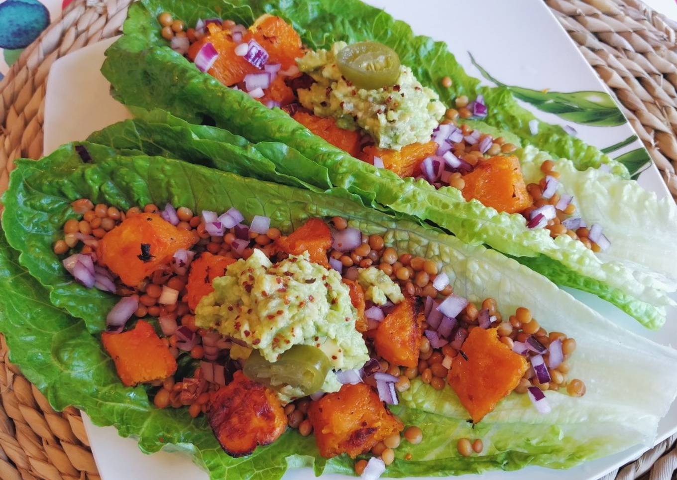 Instructions to make to make Tacos veganos de lechuga con lentejas y calabaza
