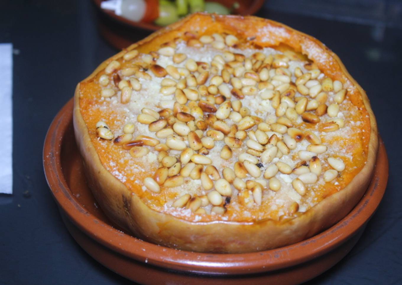 Calabaza al horno con beicon y piñones