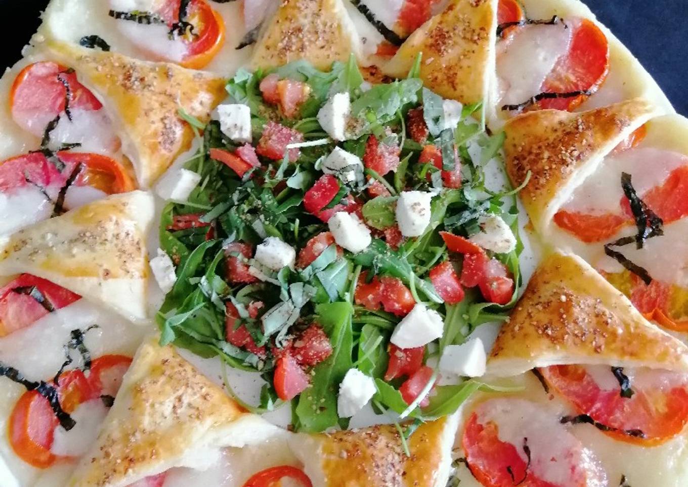 - En el centro poner un poco de rúcula, tomate picado, Mozzarella cortada en dados y albahaca picada. Aliñar con sal y aceite de oliva virgen extra