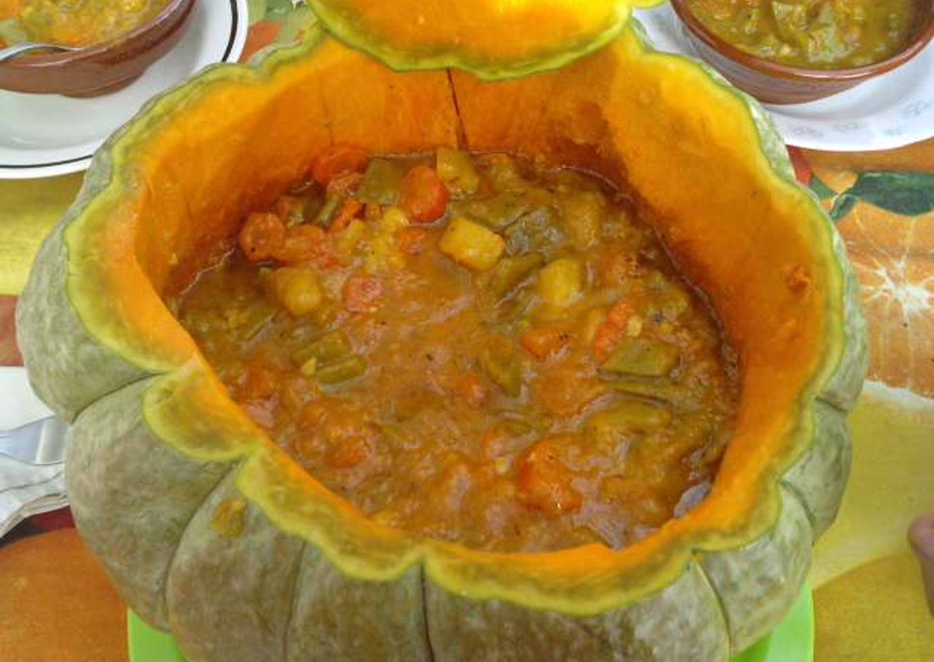 - Por último, echar todo el guisote a la calabaza hueca con mucho cuidado y ya estará lista para comer. Poner la tapa y a servir. :P