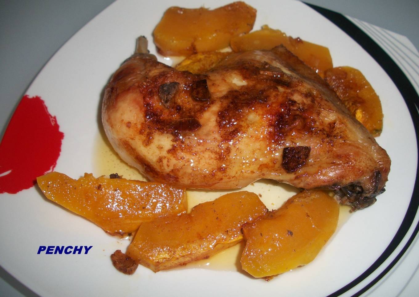 Contramuslo de pollo asado al horno, previamente especiado, y acompañado de calabaza, en vez de patatas, queda ideal.