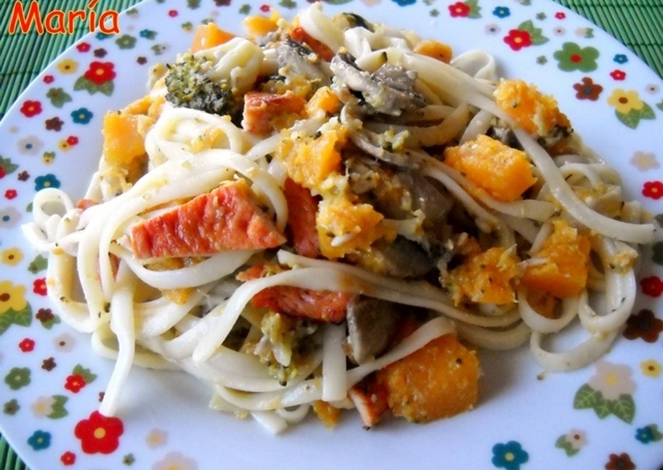 La verdura, siempre presente en mi mesa, casa de maravilla con todo tipo de pasta, asi es que hoy he empleado calabaza, champiñones y unos ramitos de brócoli que me sobraron ayer.