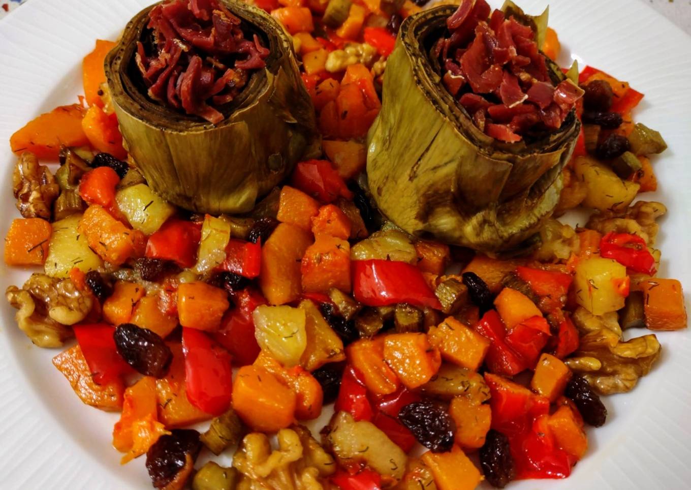 Alcachofas rellenas de jamón con salteado de frutas, verduras y frutos secos