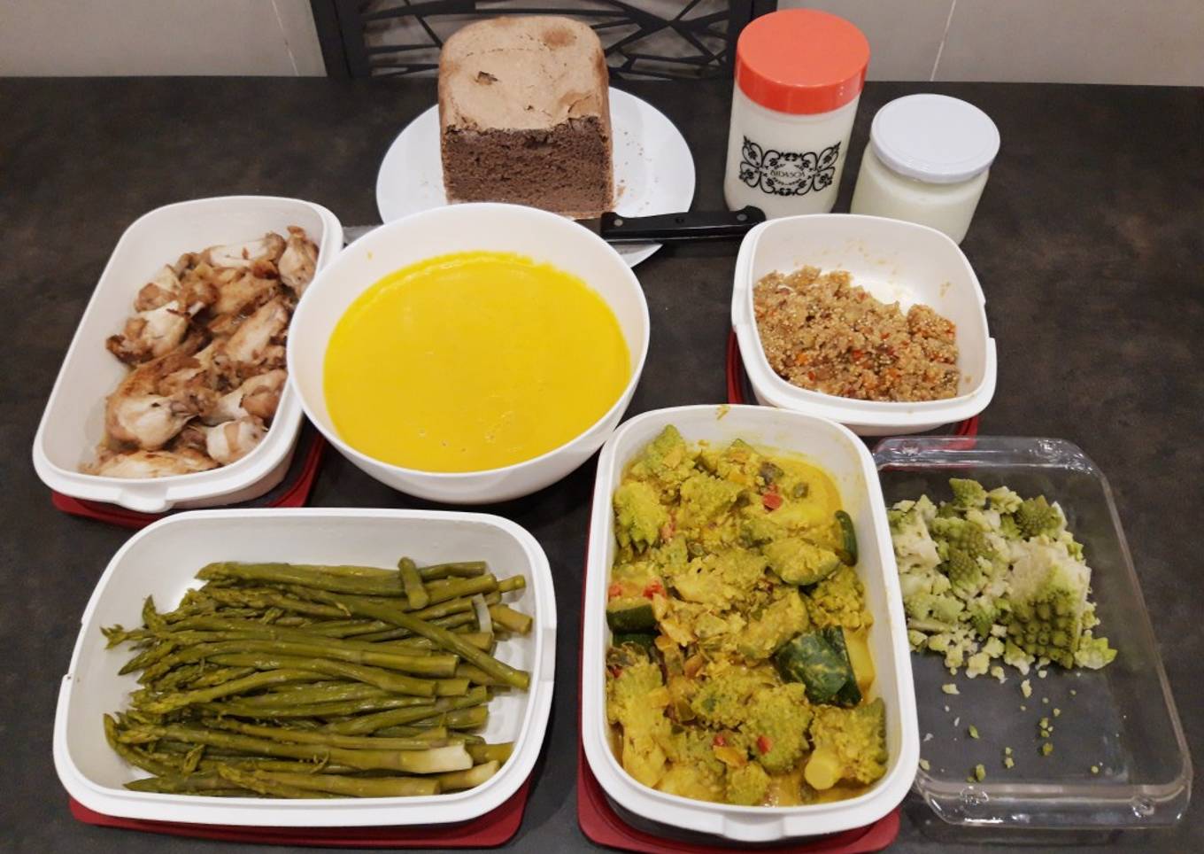 Batch cooking hecho el fin de semana anterior, como siempre con variedad de verduras. Esta vez he incluido pollo, y una novedad, un pan de trigo sarraceno hecho en panificadora.