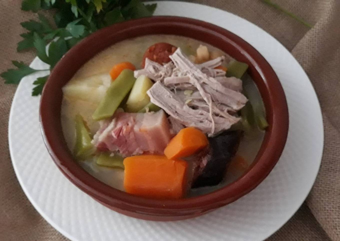 - Como lo vamos a cocinar en olla exprés, haremos dos cocciones, primero ponemos en la olla, la carne, garbanzos (que hemos puesto en remojo la noche anterior), tocino, chorizo, hueso y manteca añeja, todo esto y unos 2, 5 litros de agua, cocerá 20 minutos una vez que la olla empiece a pitar. Si lo hacemos en olla normal cocerá hasta que los garbanzos y la carne estén tiernos.