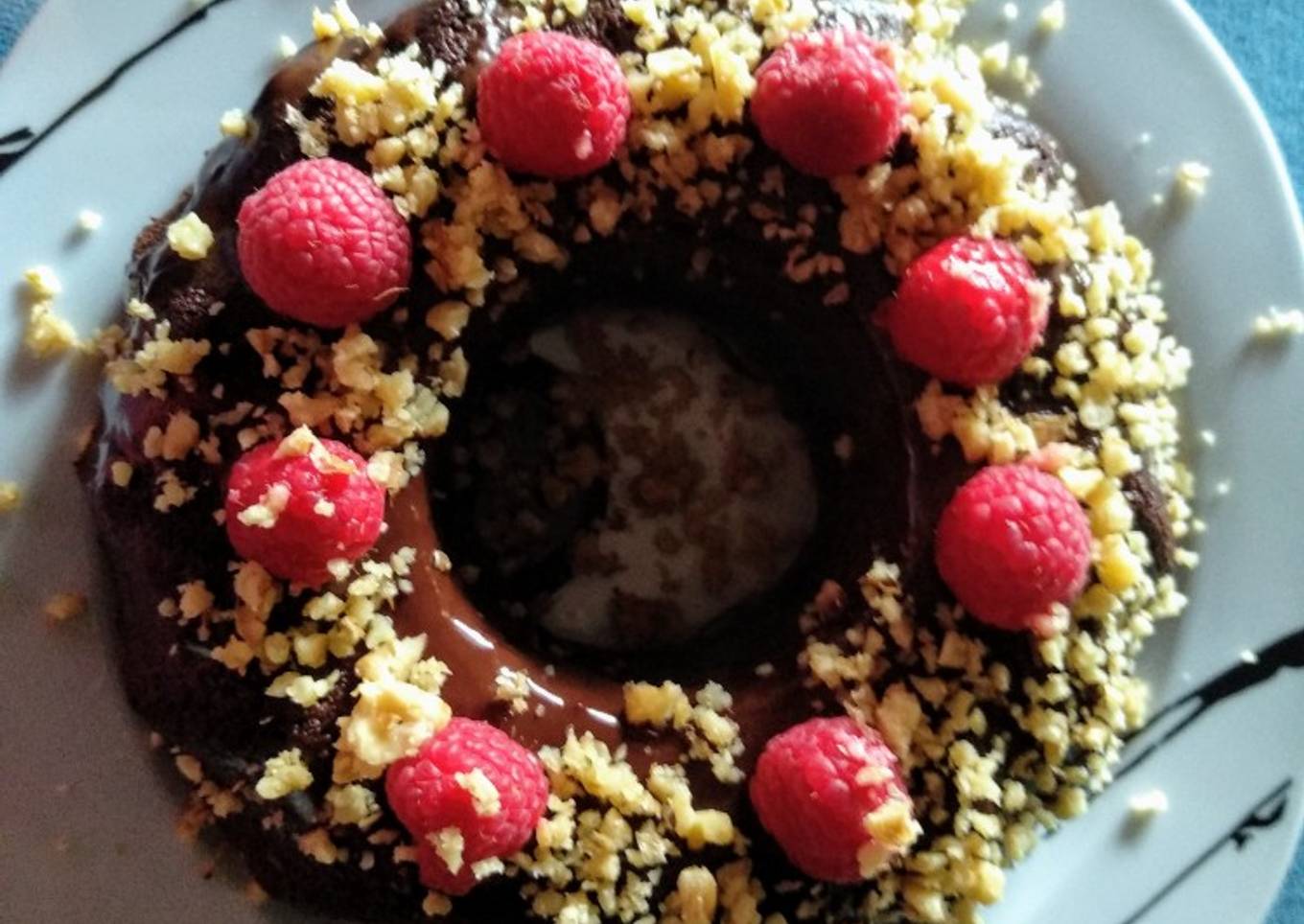 - Deshacer el chocolate negro en el microondas junto con leche de soja y bañar el molde, poner unas frambuesas y nueces picadas