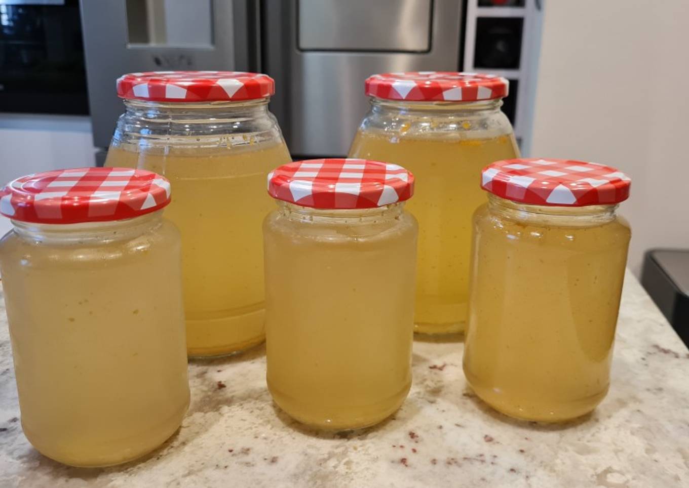 - Al día siguiente, sacamos el caldo de la nevera, retiramos la capa de grasa que se ha formado y lo colamos de nuevo antes de echarlo en tarros de cristal, como es mucha cantidad lo que no uséis en ese momento podéis congelarlo. Ya tenemos nuestro caldo, probad a hacerlo, ya veréis qué rico!!