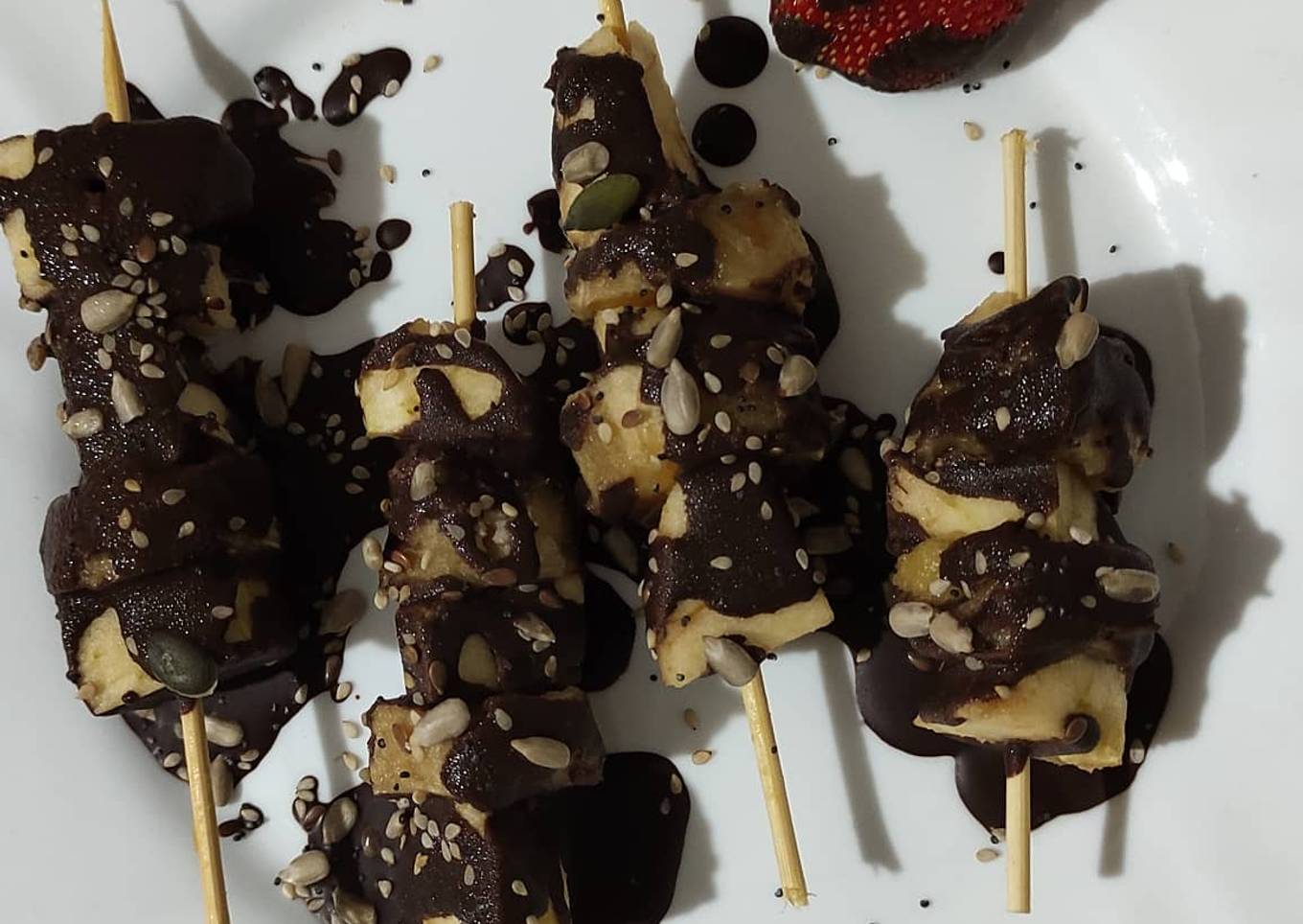 Las pinchamos con un palo de pinchos, alternando las frutas que hayamos escogido. 🍢 - Fundimos el chocolate junto al aceite de coco, al micro (1/2 minutos, parando cada poco para que no se queme) o al baño María.