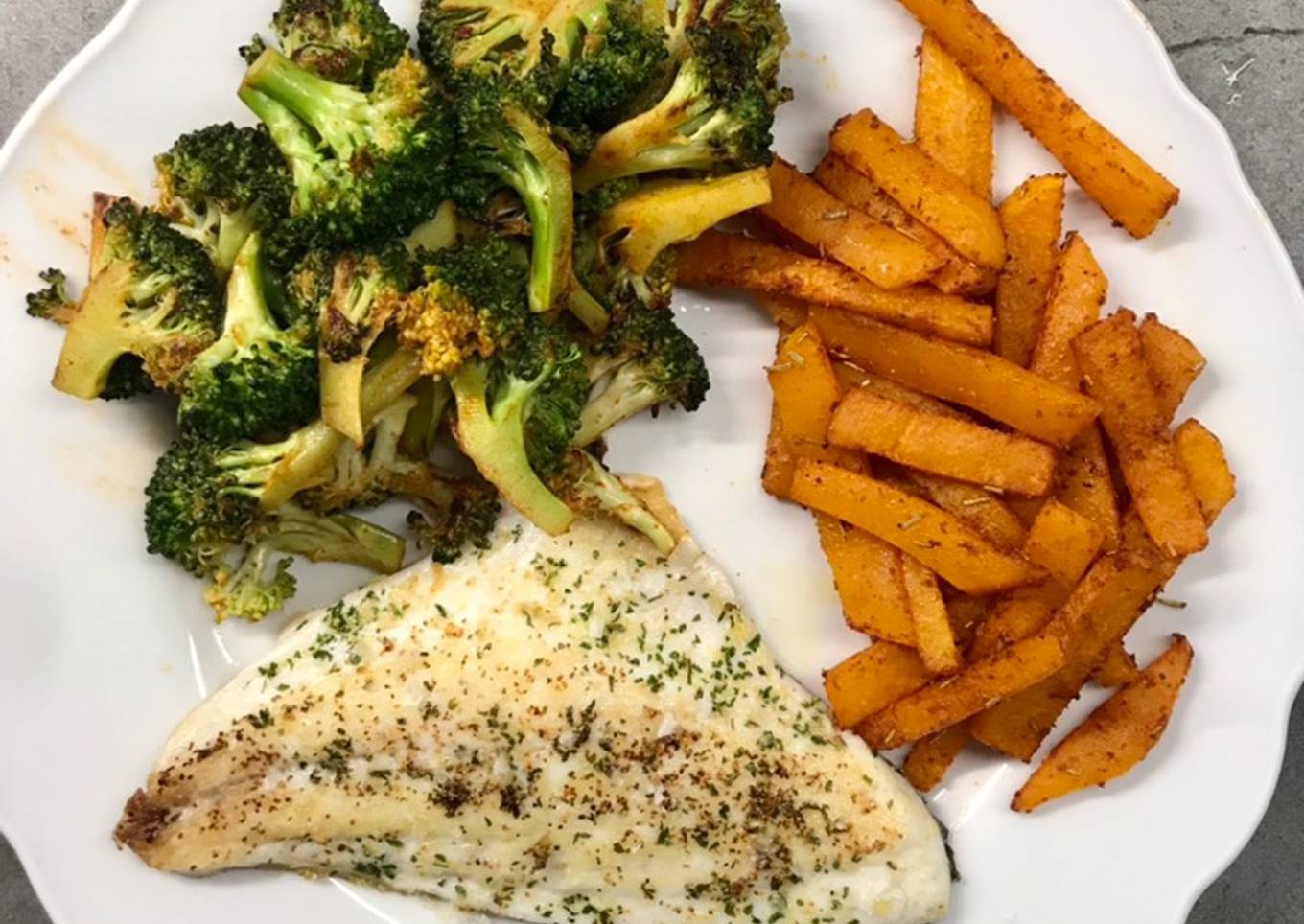 Podemos asar el brócoli también o, en mi caso, lo hice a la plancha en la sartén. - Cuando tengamos la calabaza asada y el brócoli hecho, hacemos en último lugar la lubina, ya que tarda muy poco (unos 3 min por lado)