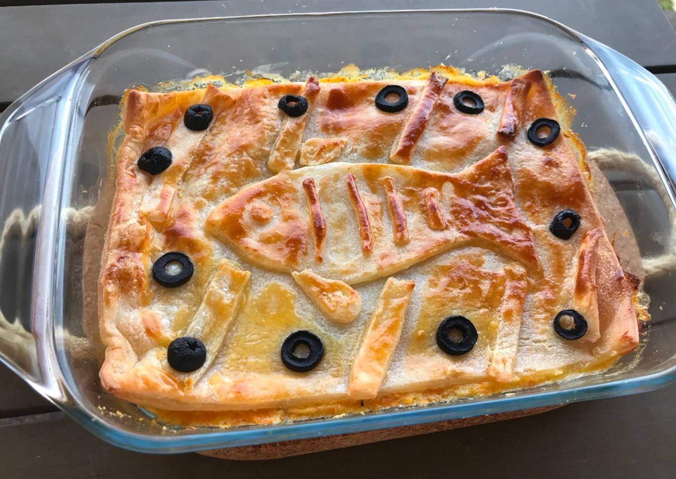 - Poner masa de hojaldre y hacer la decoración del pescado. Pintar con yema de huevo batido.