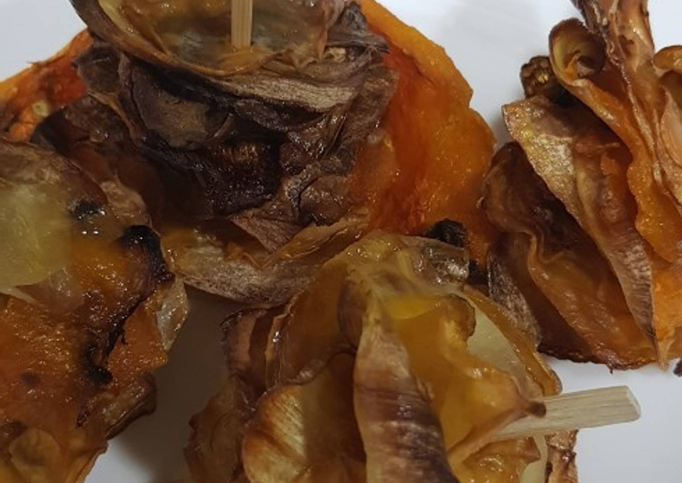- Una vez crujientes las verduras... servir en pincho...con la cama de las hojas de zanahorias.